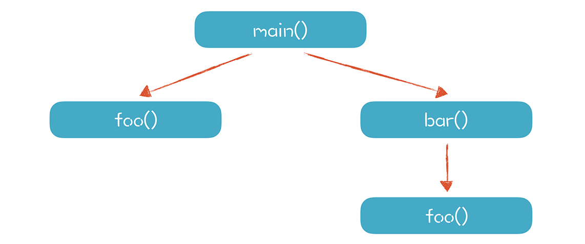 我们首先激活(Activate)main()函数,main()函数又激活foo()函数,然后又激活bar()函数,bar()函数还会激活foo()函数,其中foo()函数被两次以不同的路径激活。