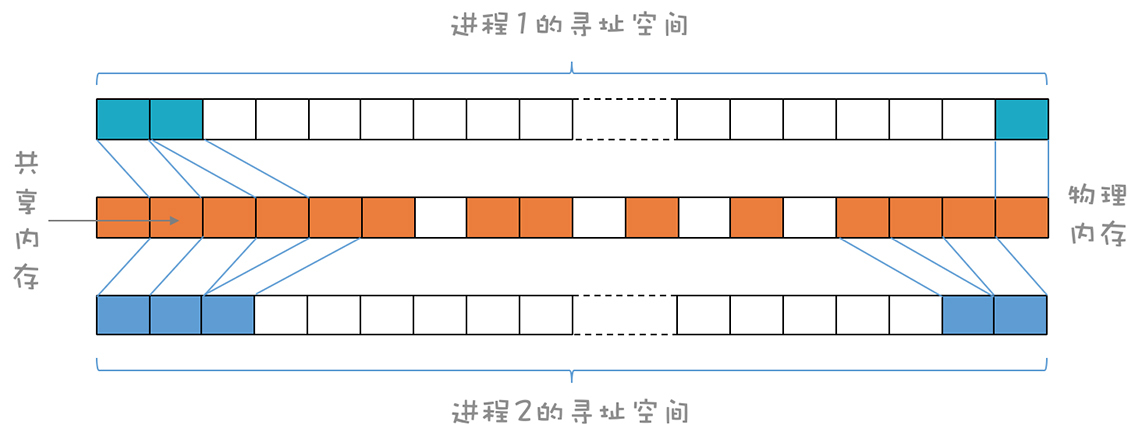 在存在操作系统的情况下,程序逻辑上可使用的内存一般大于实际的物理内存。程序在使用内存的时候,操作系统会把程序使用的逻辑地址映射到真实的物理内存地址。有的物理内存区域会映射进多个进程的地址空间。
