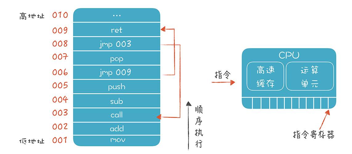 每次加载一条代码,程序都会顺序执行,碰到跳转语句,才会跳到另一个地址执行。CPU里有一个指令寄存器,里面保存了下一条指令的地址。