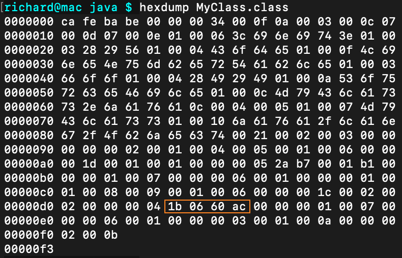 你可以用“hexdump MyClass.class”显示字节码文件的内容,从中可以发现这个片段(就是橙色框里的内容):