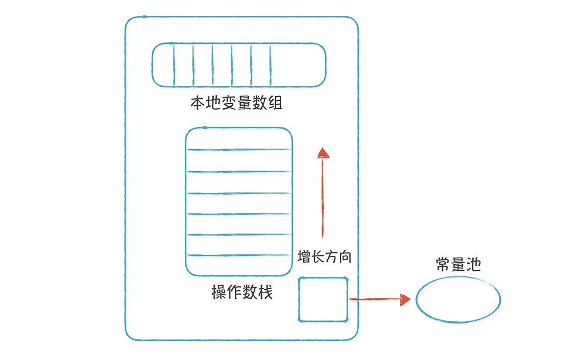 每一个线程都有一个JVM栈,每次调用一个方法都会生成一个栈桢,来支持这个方法的运行。栈桢里面又包含了本地变量数组(包括方法的参数和本地变量)、操作数栈和这个方法所用到的常数。这种栈桢的设计跟之前我们学过C语言的栈桢的结构,其实有很大的相似性,你可以通过21讲回顾一下。