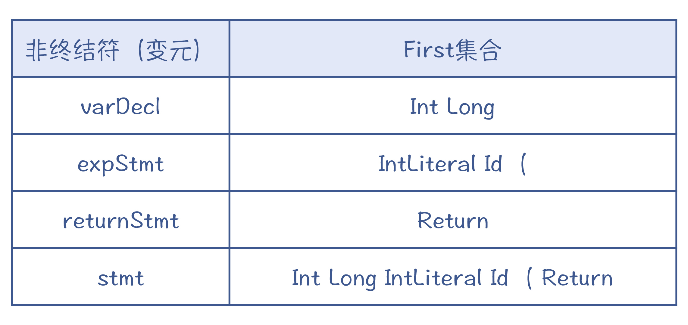 而stmt的First集合,就是三个产生式的First集合的并集,也是Int Long IntLiteral Id ( Return。