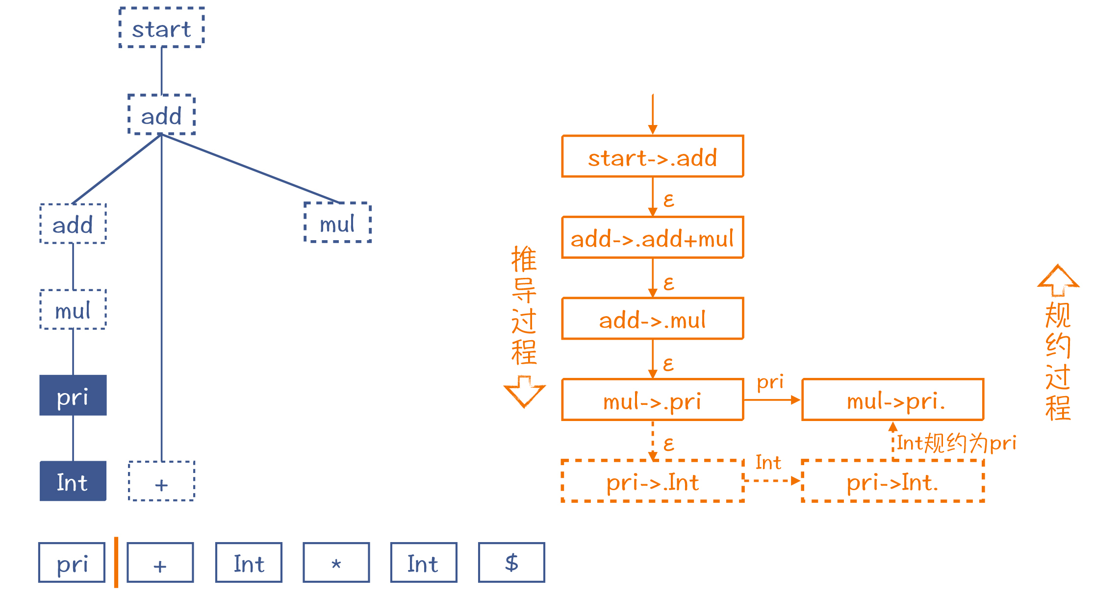 所以你就可以根据这棵假想的AST,也就是依据假想的推导过程,给它反推回去。把Int还原为pri。这个还原过程,就叫做“规约”(Reduce)。工作区里的元素也随之更新成pri。