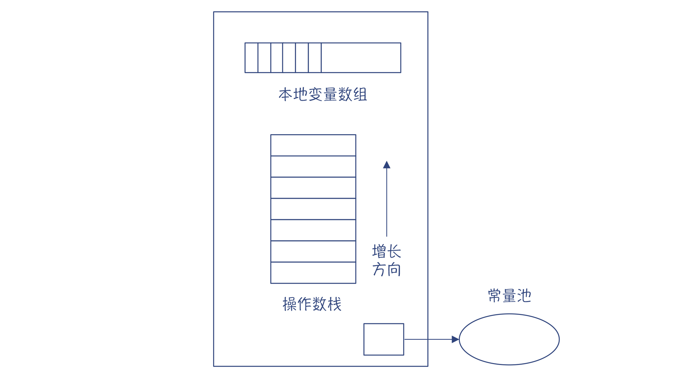 JVM中,每一个线程都有一个JVM栈,每次调用一个方法都会生成一个栈帧,来支持这个方法的运行。这跟C语言很相似。但JVM的栈帧比C语言的复杂,它包含了一个本地变量数组(包括方法的参数和本地变量)、操作数栈、到运行时常量池的引用等信息。