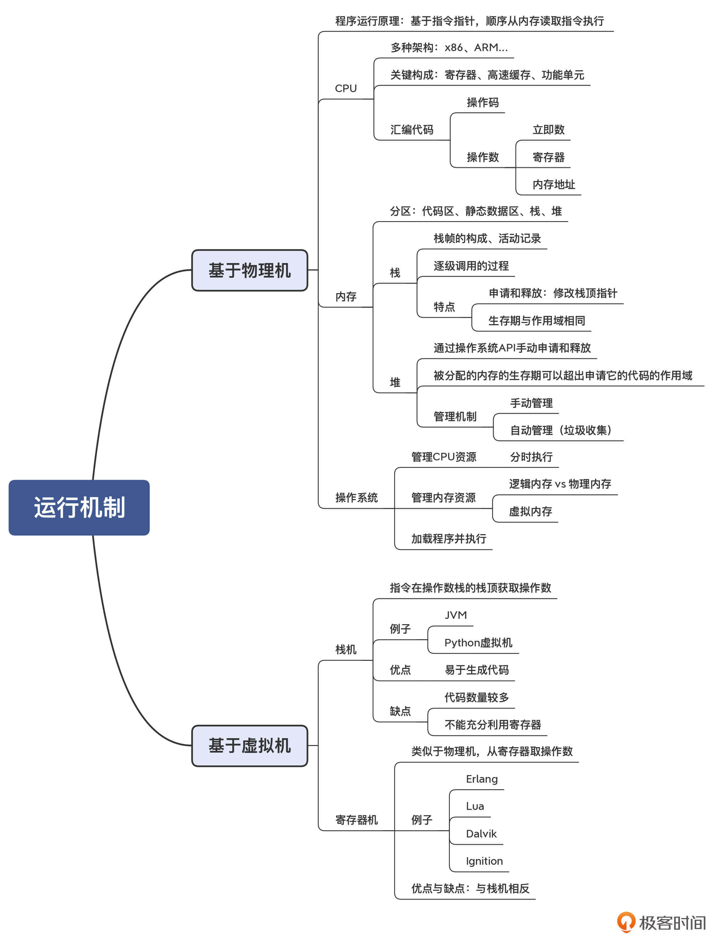 现有的程序有两大类执行模式。一类是编译成本地代码(机器码),运行在物理机和操作系统上,这时候你需要掌握目标机器的汇编代码,知道指令是如何跟CPU和内存打交道的,也需要知道操作系统在其中扮演了什么角色。另一大类是在虚拟机上运行的,虚拟机又分为栈机和寄存器机两大类,你需要明确它们之间的区别,才能知道为什么它们的IR是不同的,又分别有什么优缺点。