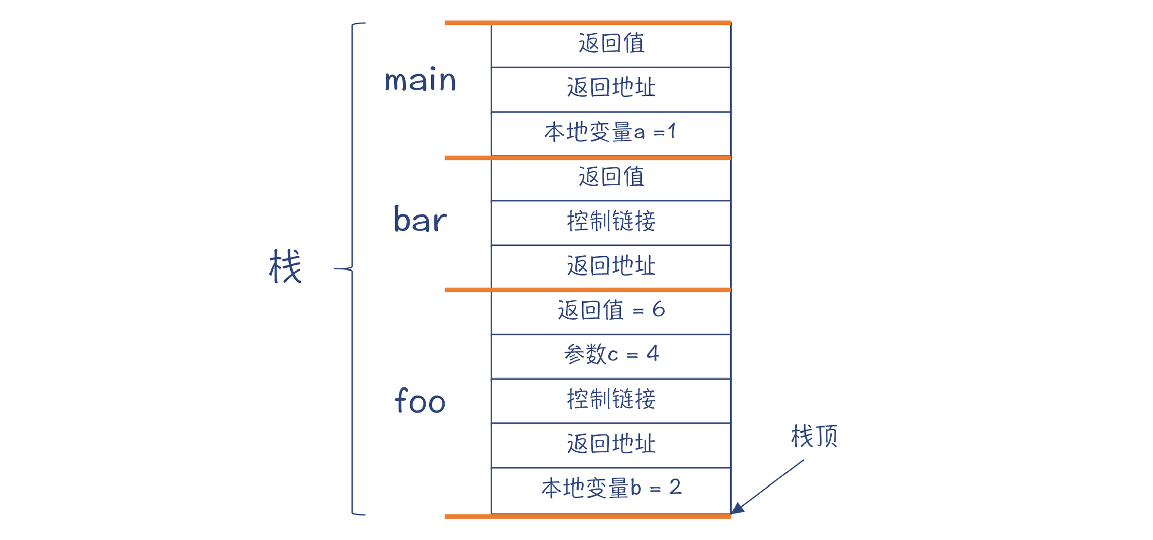 在程序里使用栈的场景是这样的,程序的运行可以看做是在逐级调用函数(或者叫过程)。像下面的示例程序,存在着main->bar->foo的调用结构,这也就是控制流转移的过程。