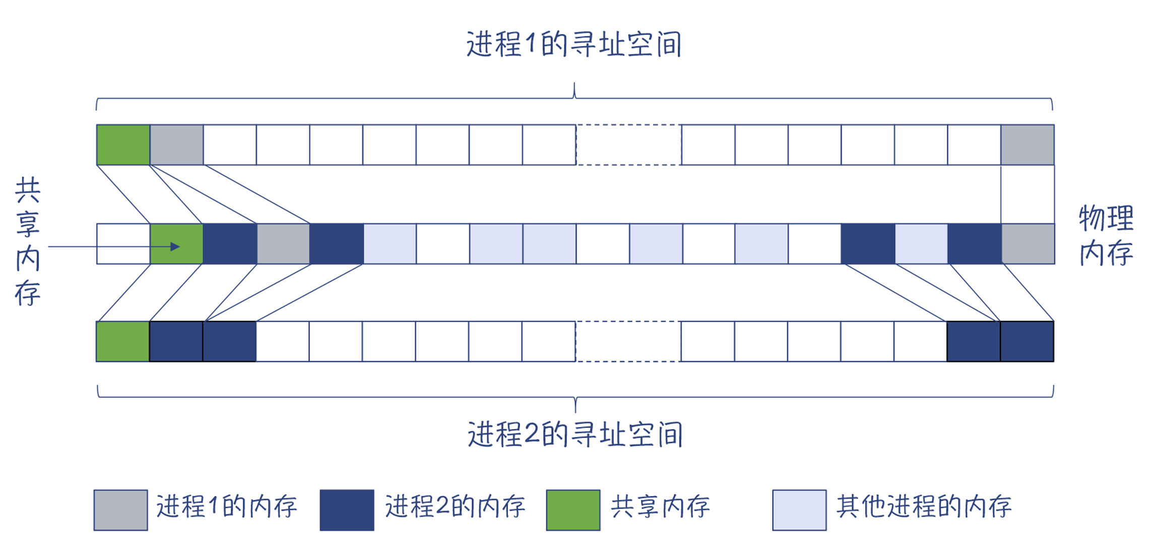 对于有些物理内存的内容,还可以映射进多个进程的地址空间,以减少内存的使用。比如说,如果进程1和进程2运行的是同一个可执行文件,那么程序的代码段是可以在两个进程之间共享的。你在图中可以看到这种情况。