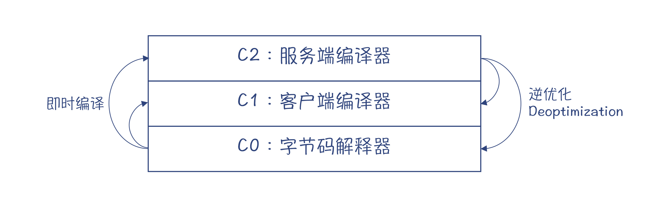 在运行过程中,HotSpot首先会用C0解释执行;接着,HotSpot会用C1快速编译,生成机器码,从而让运行效率提升。而对于运行频率高的热点(HotSpot)代码,则用C2深化编译,得到运行效率更高的代码,这叫做分层编译(Tiered Compilation)。