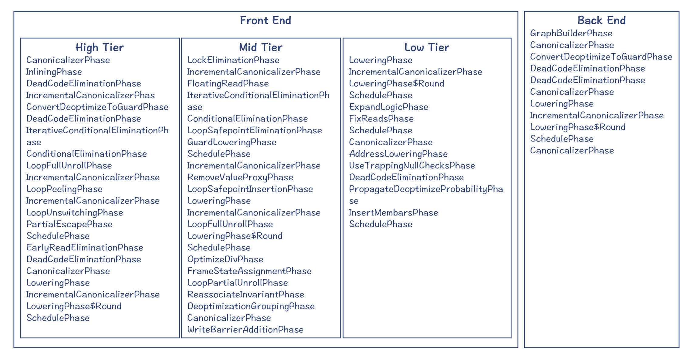 接着,你会看到,整个编译过程被分成了前端和后端两个部分。前端部分使用的IR是HIR。而且在前端部分,HIR又分成了高(HighTier)、中(MidTier)、低(LowTier)三层。在每个层次里,都要执行很多遍(Phase)对图的处理。这些处理,指的就是各种的优化和处理算法。而从高到低过渡的过程,就是不断Lower的过程,也就是把IR中,较高抽象度的节点替换成了更靠近底层实现的节点。