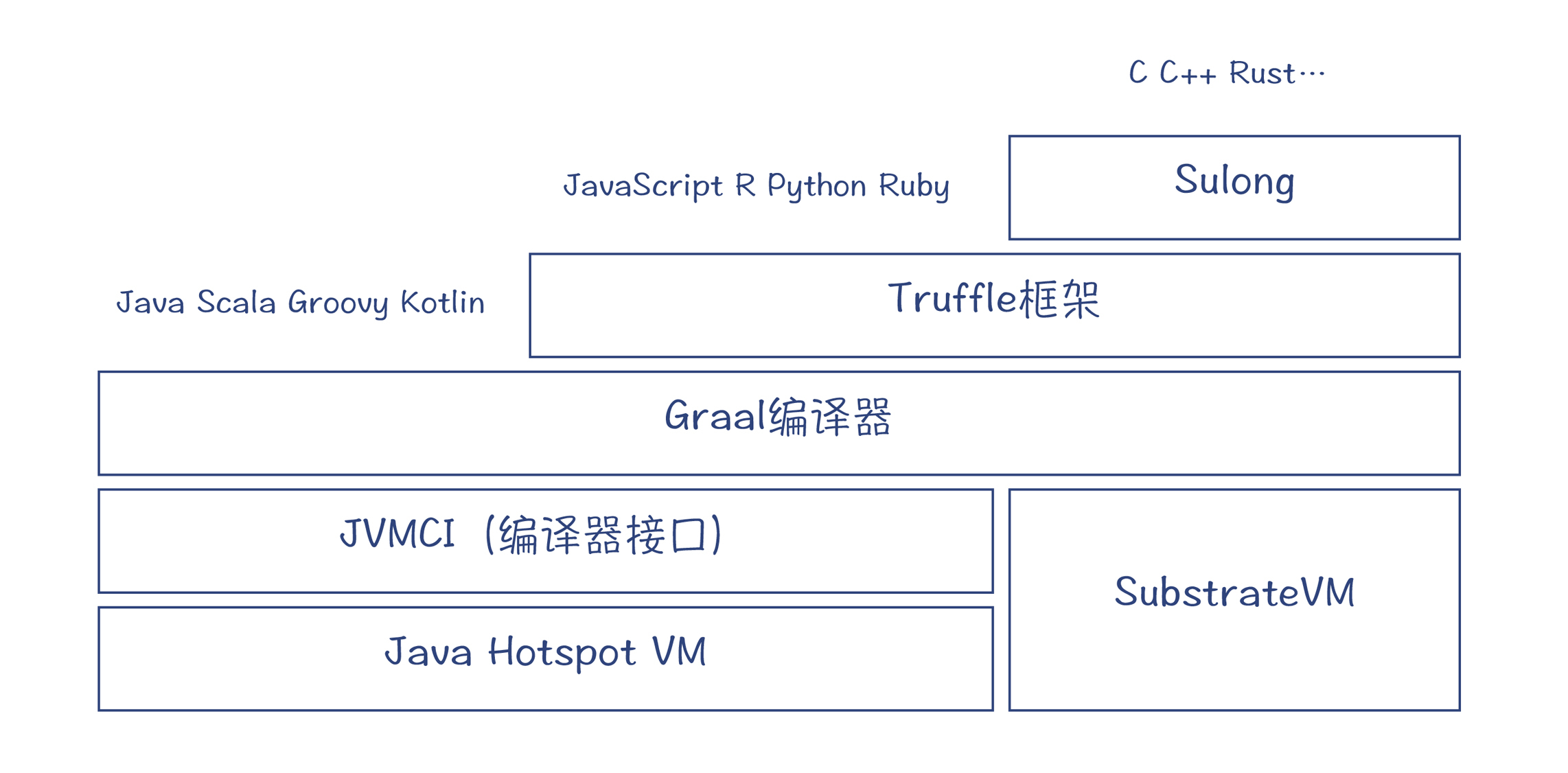 再进一步,它还通过一个Sulong框架支持LLVM IR,从而支持那些能够生成LLVM IR的语言,如C、C++、Rust等。想想看,在Java的虚拟机上运行C语言,还是有点开脑洞的!