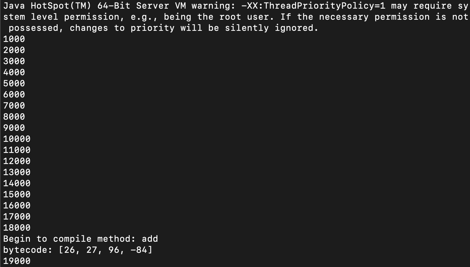 当程序运行以后,根据打印的信息,你就能判断出JIT编译器是否真的被调用了。实际上,它是在add方法执行了15000次以后才被调用的。这个时候,JVM会认为add方法是一个热点。因为JIT是在另一个线程启动执行的,所以输出信息要晚一点。