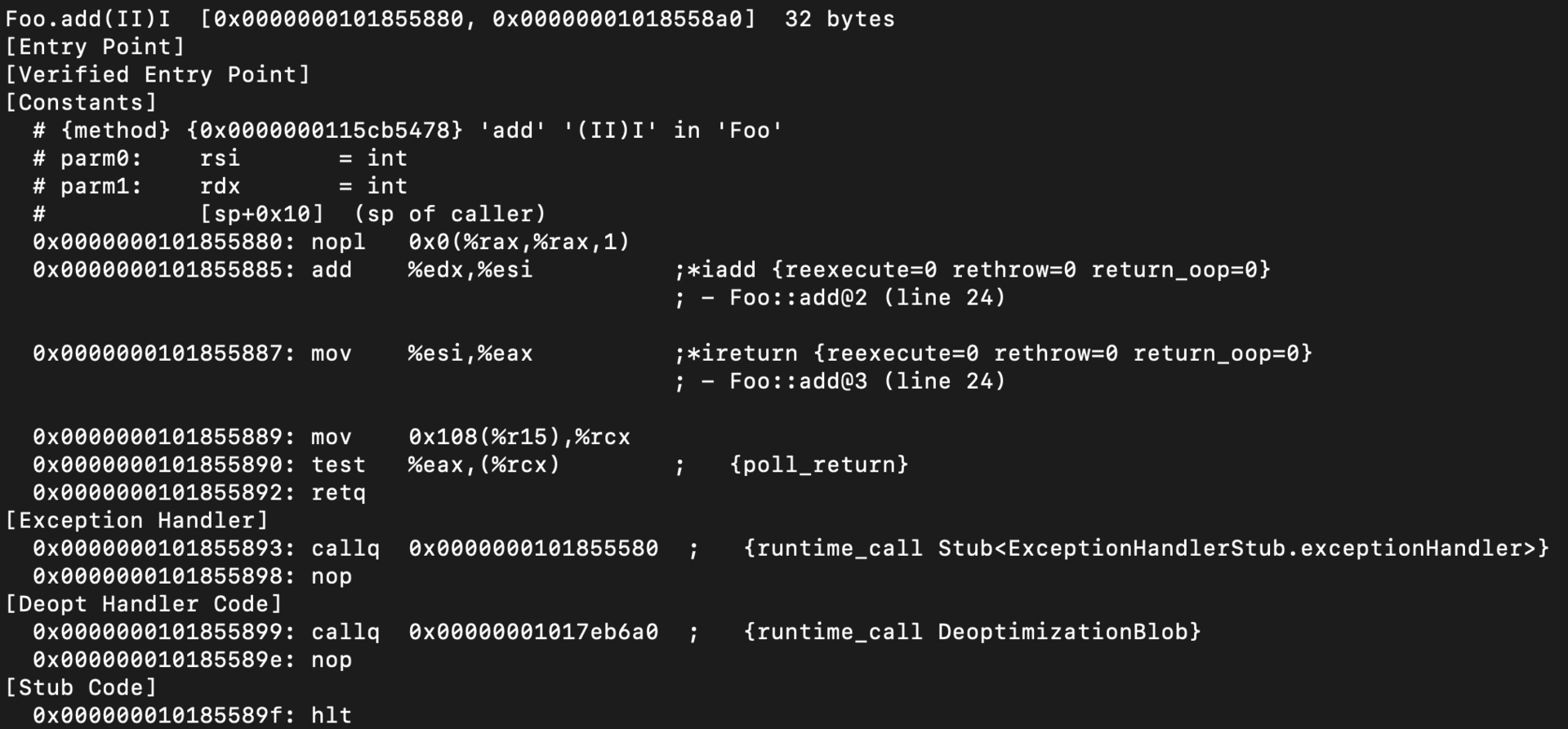我们暂时忽略掉这中间的编译过程,先来看看JIT编译后生成的机器码。