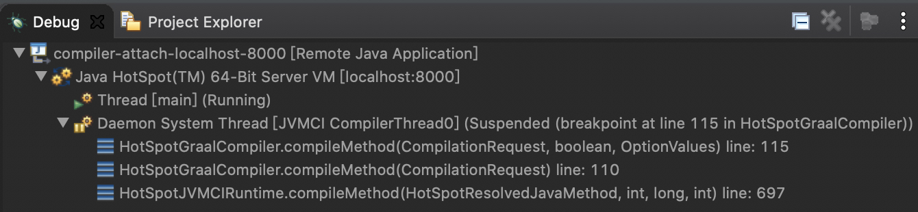 为了方便调试,我在org.graalvm.compiler.hotspot.compileMethod()方法中设置了断点,所以到了断点的时候,程序就会停下来,而不是一直运行到结束。
