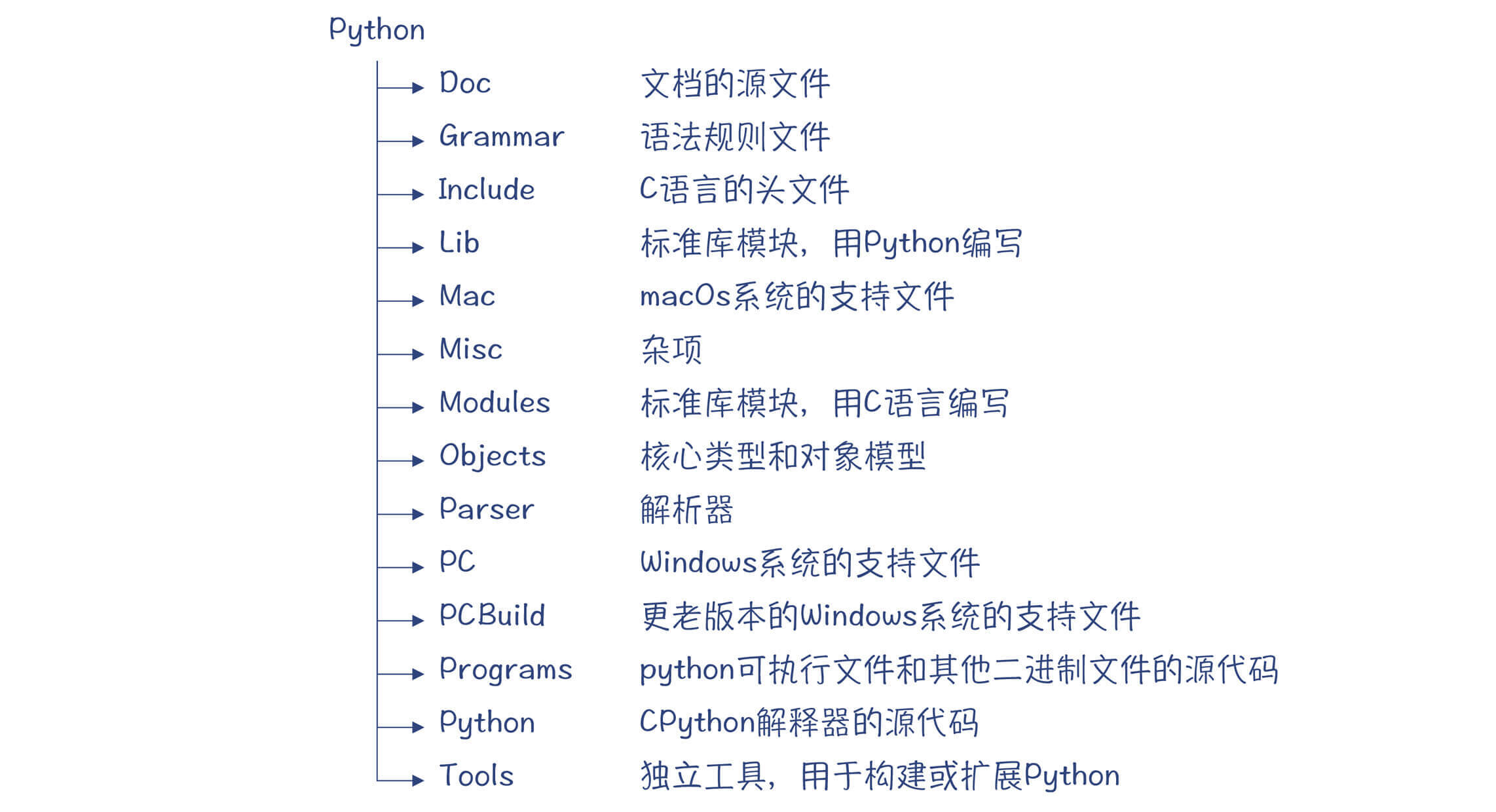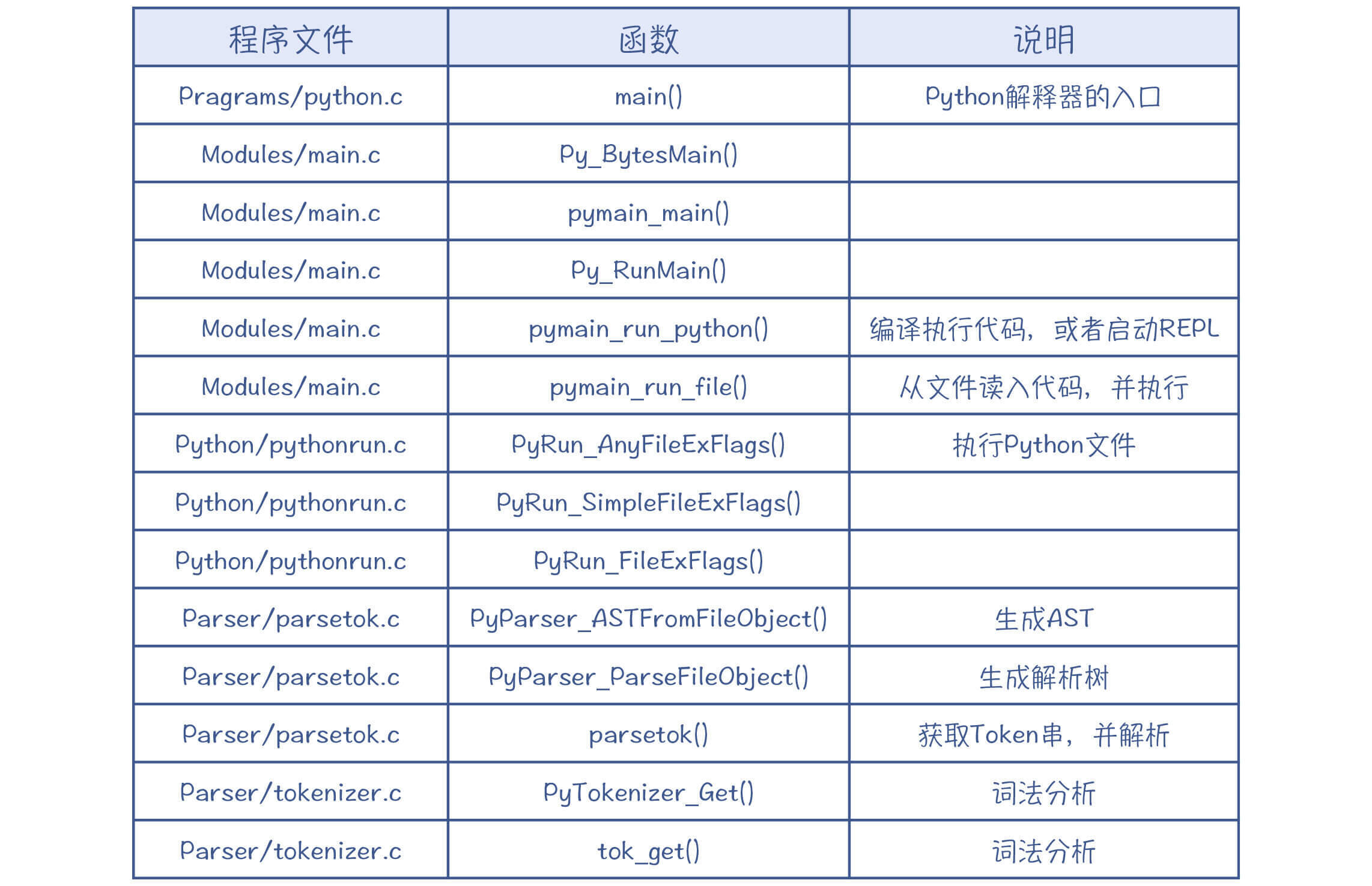 首先,你可以从python.org网站下载3.8.1版本的源代码。解压后你可以先自己浏览一下,看看能不能找到它的词法分析器、语法分析器、符号表处理程序、解释器等功能的代码。