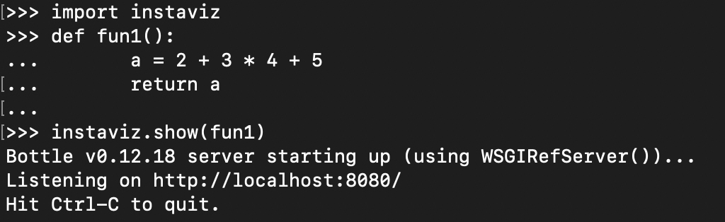 如果你嫌这样不够直观,还可以用另一个工具“instaviz”,在命令行窗口用pip命令安装instaviz模块,以图形化的方式更直观地来显示AST。instaviz是“Instant Visualization”(立即可视化)的意思,它能够图形化显示AST。