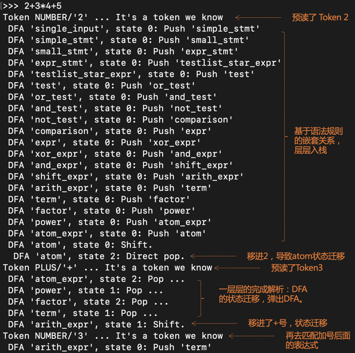 你还可以用“-d”参数运行python,然后在REPL里输入程序,这样它就能打印出这些调试信息,包括什么时候把DFA入栈、什么时候出栈,等等。我截取了一部分输出信息,你可以看一下。
