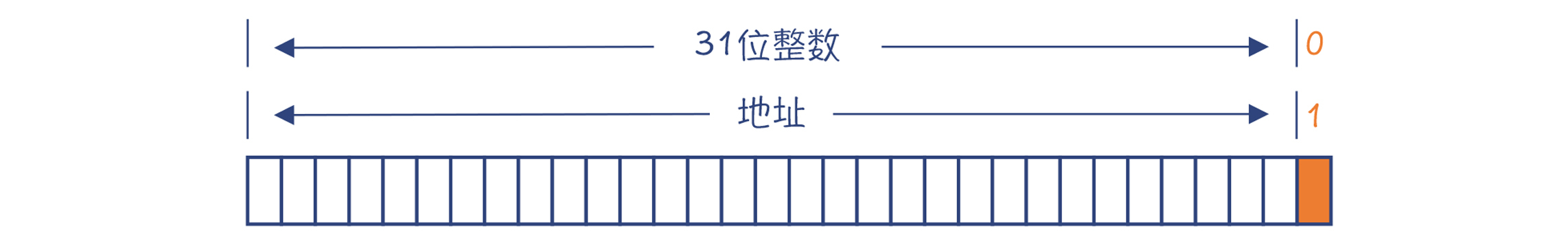 比如说,对于一个32位的指针值,它的最低位是标记位。当标记位是0的时候,前31位是一个短整数(简写为Smi);而当标记位是1的时候,那么前31位是一个地址。这样,V8就可以用指针来直接保存一个整数值,用于计算,从而降低了内存占用,并提高了运行效率。