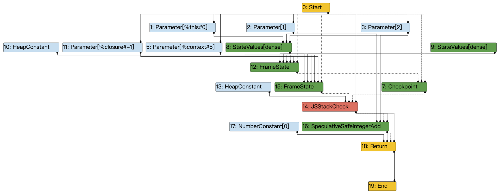 你可以看到,在第一步“v8.TFBytecodeGraphBuilder”阶段显示的IR中,它显示的节点还是有点儿多。我们先隐藏掉与计算功能无关的节点,得到了下面的主干。你要注意其中的绿色节点,这里已经进行了类型推测,因此它采用了一个整型计算节点:SpeculativeSafeIntegerAdd。