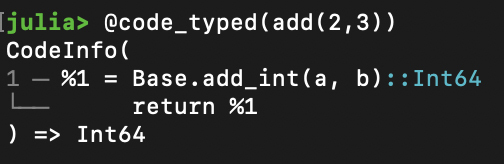 你会发现,这跟用@code_typed(add(2,3))命令打印出来的信息是一致的,只不过宏里显示的信息会更加简洁: