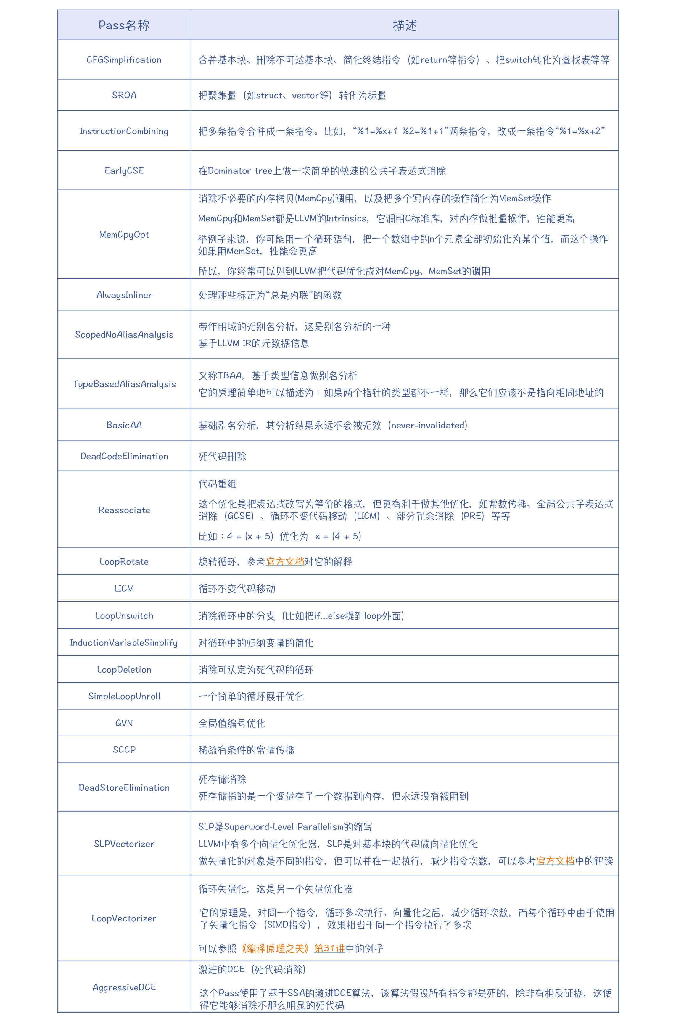 上面表格中的Pass都是LLVM中自带的Pass。你要注意,运用好这些Pass,会产生非常好的优化效果。比如,某个开源项目,由于对性能的要求比较高,所以即使在Windows平台上,仍然强烈建议使用Clang来编译,而Clang就是基于LLVM的。