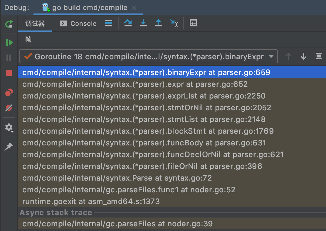 所以在这一讲的开头,我还建议你把Go语言的编译器作为你学习编译原理的“教学参考书”,建议你在图形化的IDE界面里,来跟踪调试每一个功能,这样你就能很方便去观察它的算法执行过程。