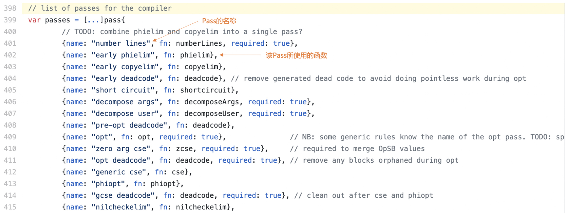 基于这样的IR来做优化,就是对IR做很多遍(Pass)的处理。在cmd/compile/internal/ssa/compile.go的代码里,列出了所有这些Pass,有将近50个。你能看到每个处理步骤执行的是哪个优化函数,你还可以在ssa.html中,看到每个Pass之后,IR都被做了哪些修改。