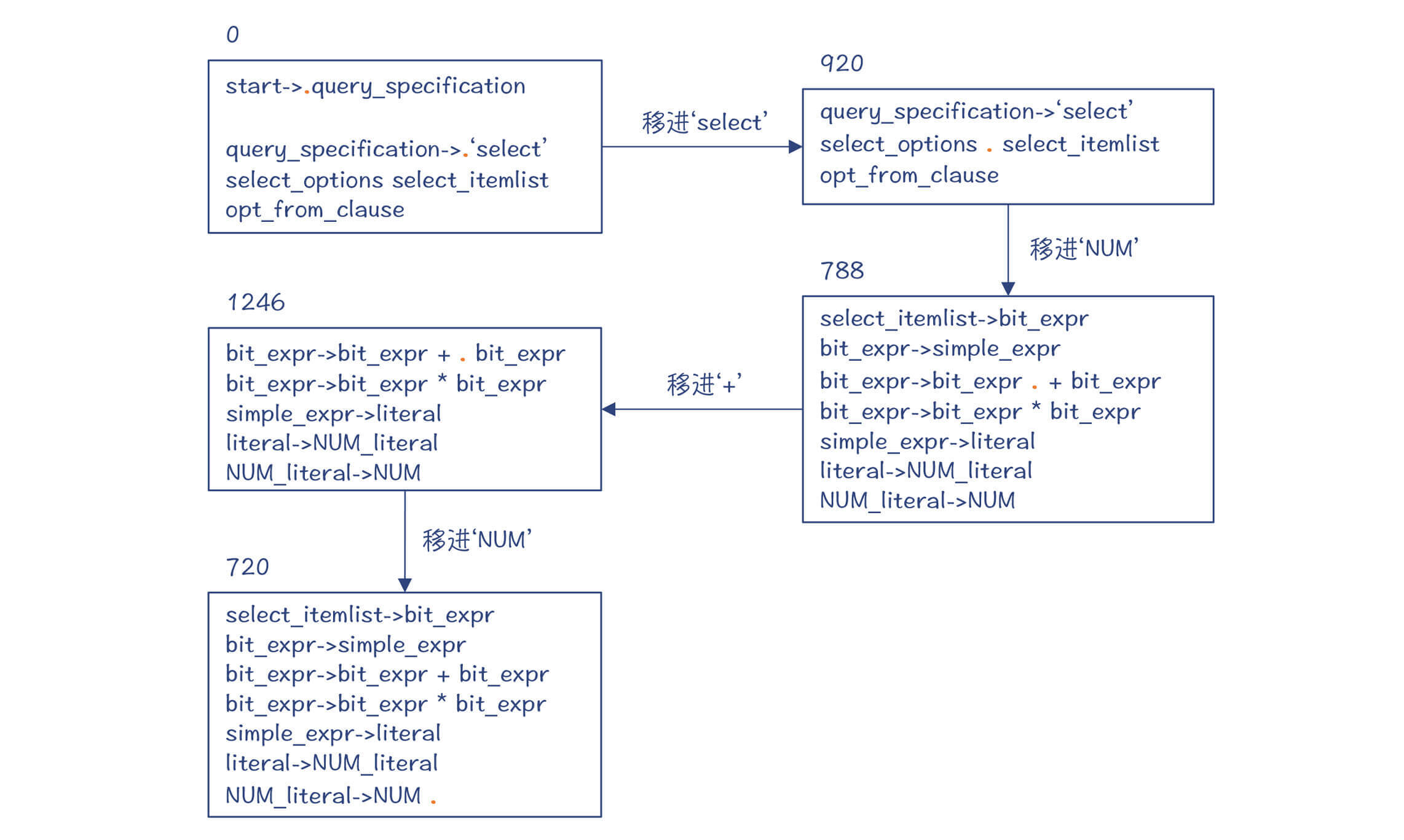 第1步,编译器处于状态0,并且预读了一个select关键字。你已经知道,LR算法是基于一个DFA的。在这里的输出信息中,你能看到某些状态的编号达到了一千多,所以这个DFA还是比较大的。