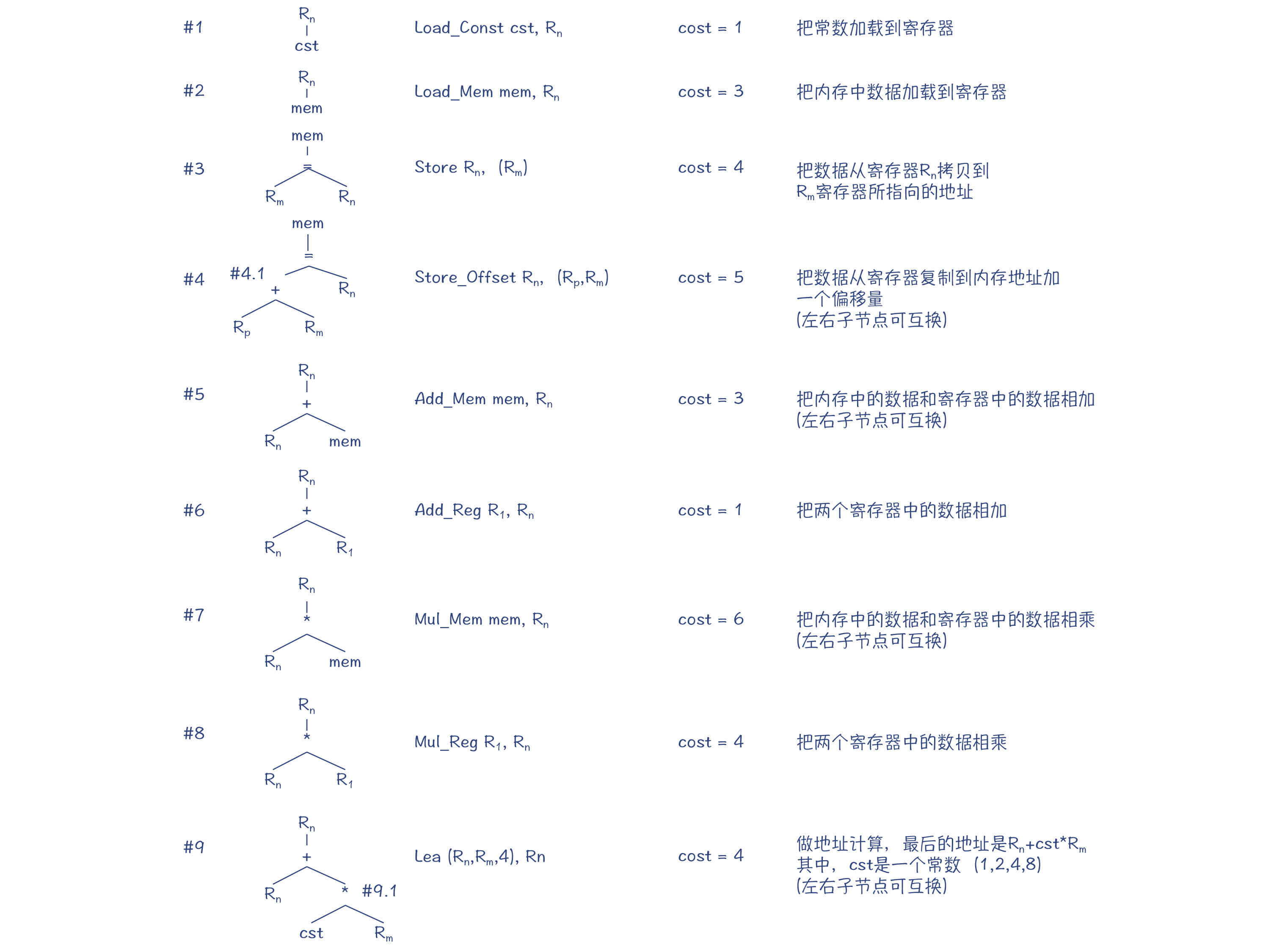 你可以看到,在图2中,对于每棵模式树,它的根节点是这个指令产生的结果的存放位置。比如,Load_Const指令执行完毕以后,常数会被保存到一个寄存器里。这个寄存器,又可以作为上一级AST节点的操作数来使用。
