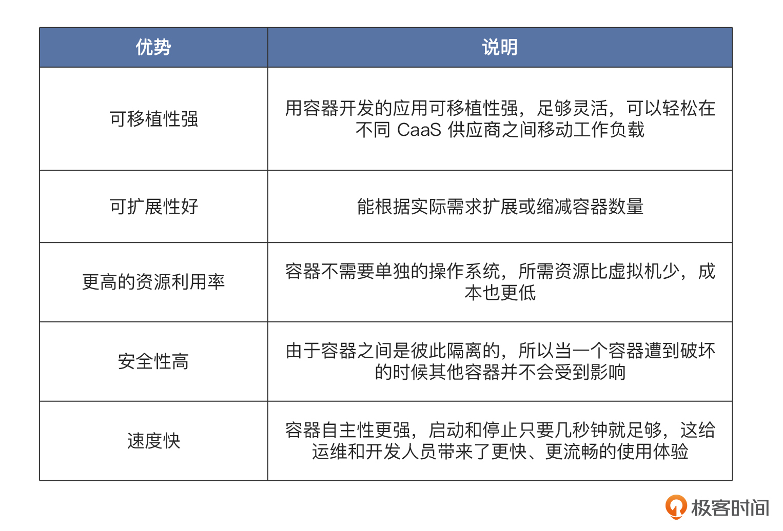 那容器都有哪些优势呢?我画了一张表格来梳理。-