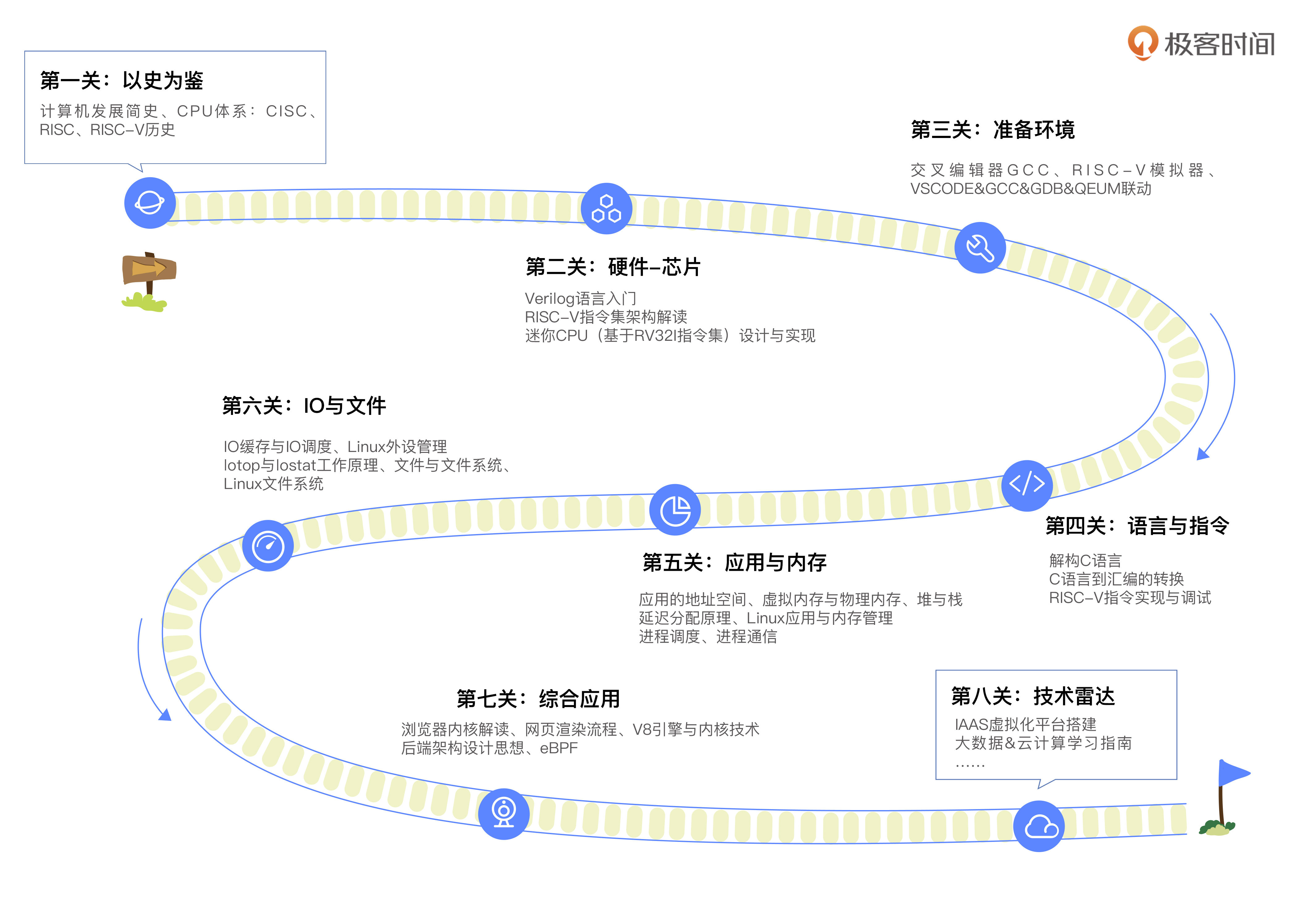 我并不会长篇累牍地给你讲什么编年史,而是重点带你了解可编程架构是怎么创造出来的、CPU从何而来、CISC和RISC又各有什么优缺点。知道了这些,你就能理解为什么现在国家要提倡发展芯片产业,RISC-V为何会大行其道。