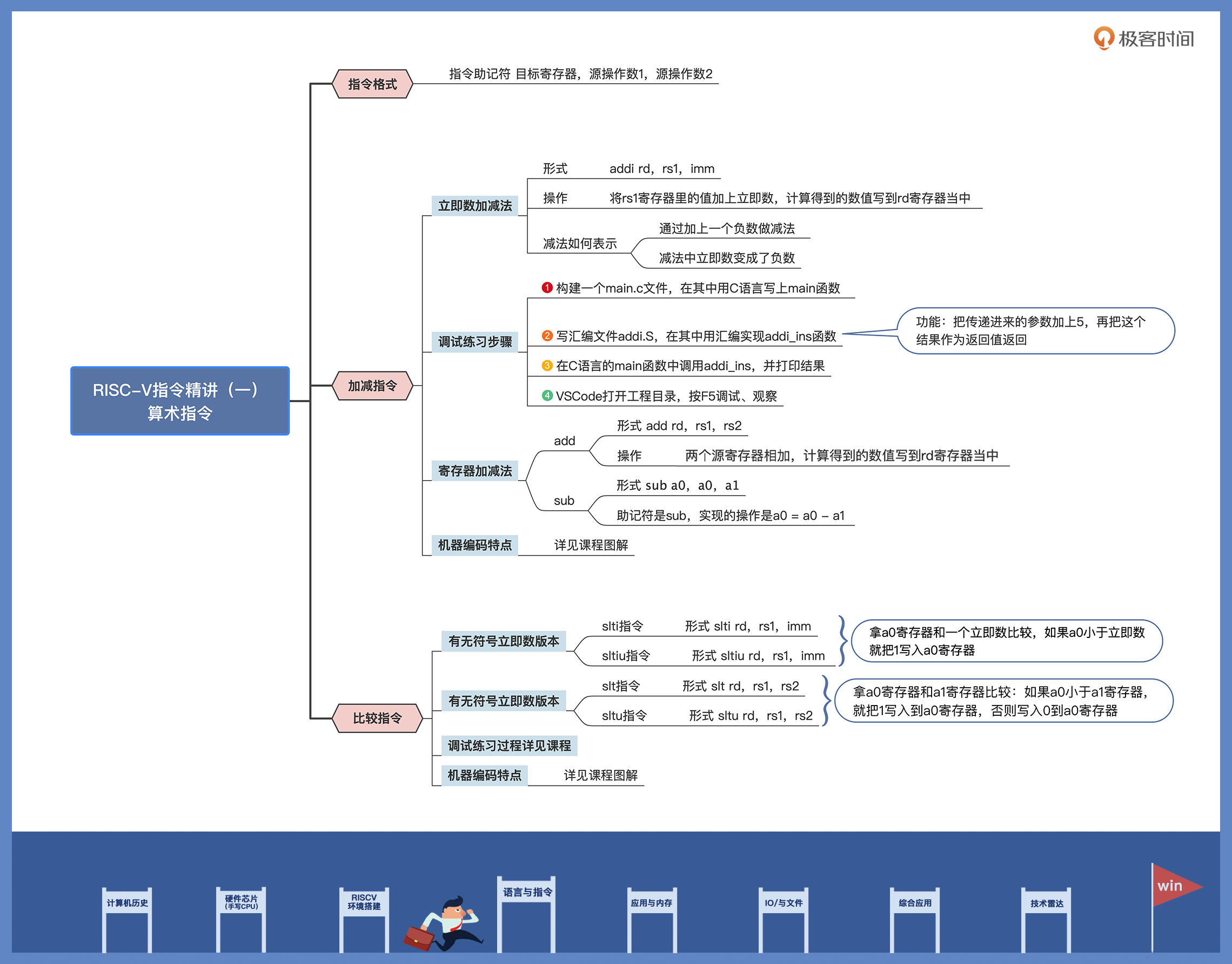 只要你耐心跟我学完这节课,对RISC-V的各种指令,你就能了如指掌了。这里我们将从RV32I的算术指令开始,先学习加减指令(add、sub),接着了解一下数值比较指令(slt)。这些指令都有两个版本,一个是立即数版本,一个是寄存器的版本。话不多说,我们开始吧。