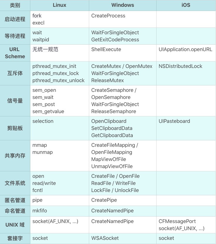 这些协同机制大体可分为:互斥、同步、资源共享以及通讯等原语。对于这些协同机制,我们对比了 Linux、Windows、iOS 这三大操作系统的支持情况,整理内容如下: