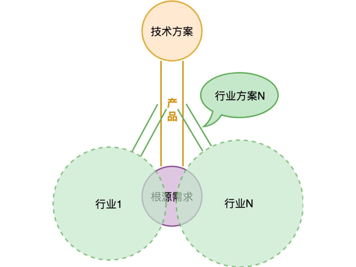 如上图所示,根源需求可能会有非常非常多的技术方案可以满足它。我们上面示意图中的小圆点是一个个用户反馈的需求。在用户提这些需求的时候,往往可能会带着他熟悉的技术方案的烙印。