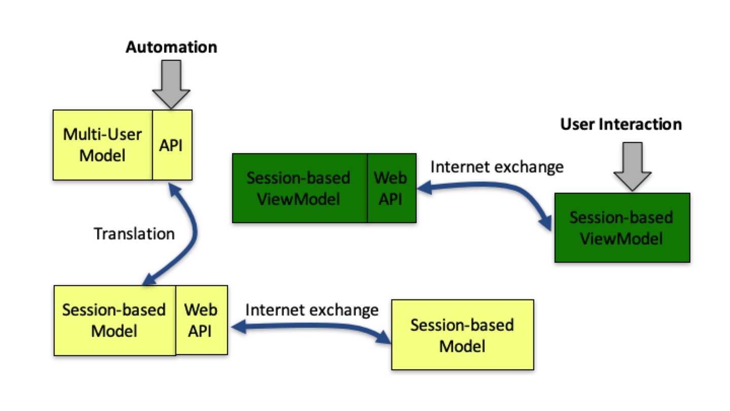 在服务端,Session-based Model 和 Session-based ViewModel 并不发生直接关联,它们通过自己网络遥控浏览器这一侧的 Model 和 ViewModel,从而响应用户的交互。