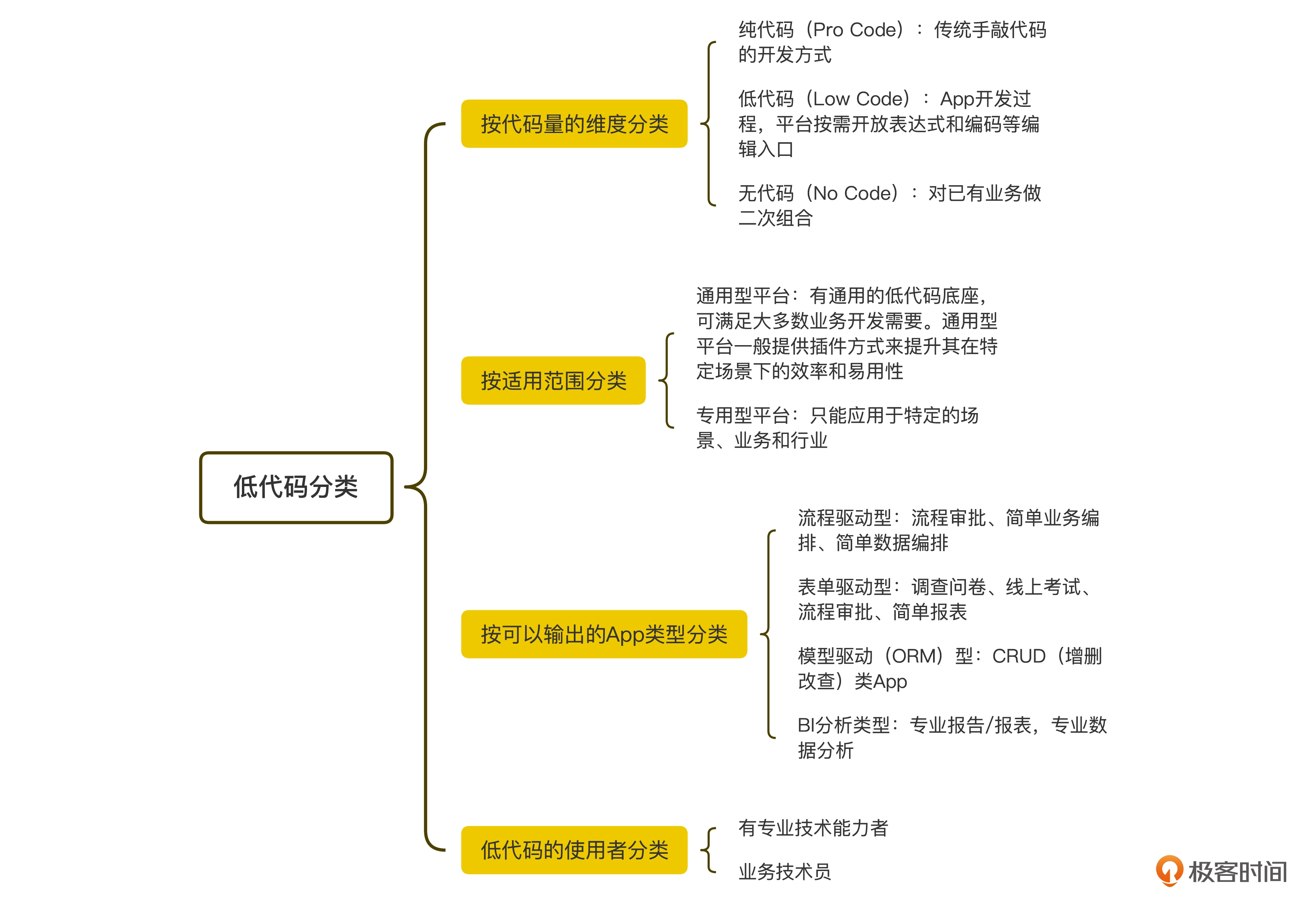 现在的状况是大家把低代码当做一只大框,啥业务开发只要能少写两行代码的,都往这个框里扔,都说是低代码。这造成了不同的人带着不同的业务背景来理解低代码,进而得到差异很大的结论,甚至连啥不能算作低代码都说不清楚。我希望通过不同维度分类的方式,来帮助你对低代码的能力、职能、目标等有一定的认知。