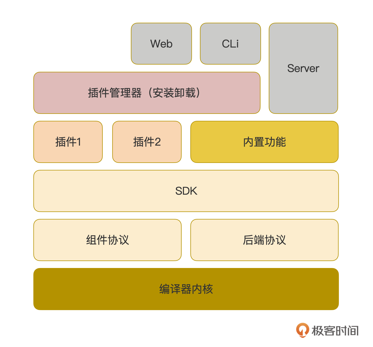 你可以看到,在编译器内核之上,是一层协议层。它是编译器对外的抽象,所有的扩展点都是由协议层来定义和约束的。SDK 则是建立在协议层之上的,它提供了编译器协议的默认实现,以及所有扩展点的基类的定义。这些基类不仅能在减轻二次开发的难度的同时,更重要的是也约束了插件必须遵守的编译协议,插件的二次开发只能按照协议所画出的套路来实现。