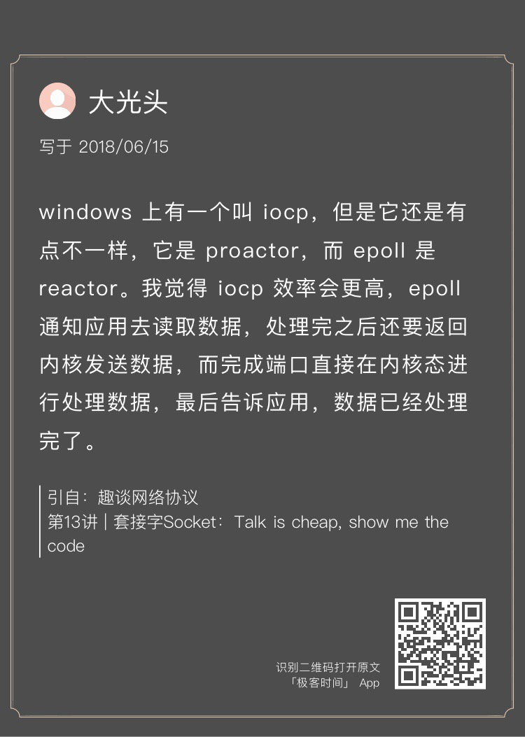 epoll是异步通知,当事件发生的时候,通知应用去调用IO函数获取数据。IOCP异步传输,当事件发生时,IOCP机制会将数据直接拷贝到缓冲区里,应用可以直接使用。