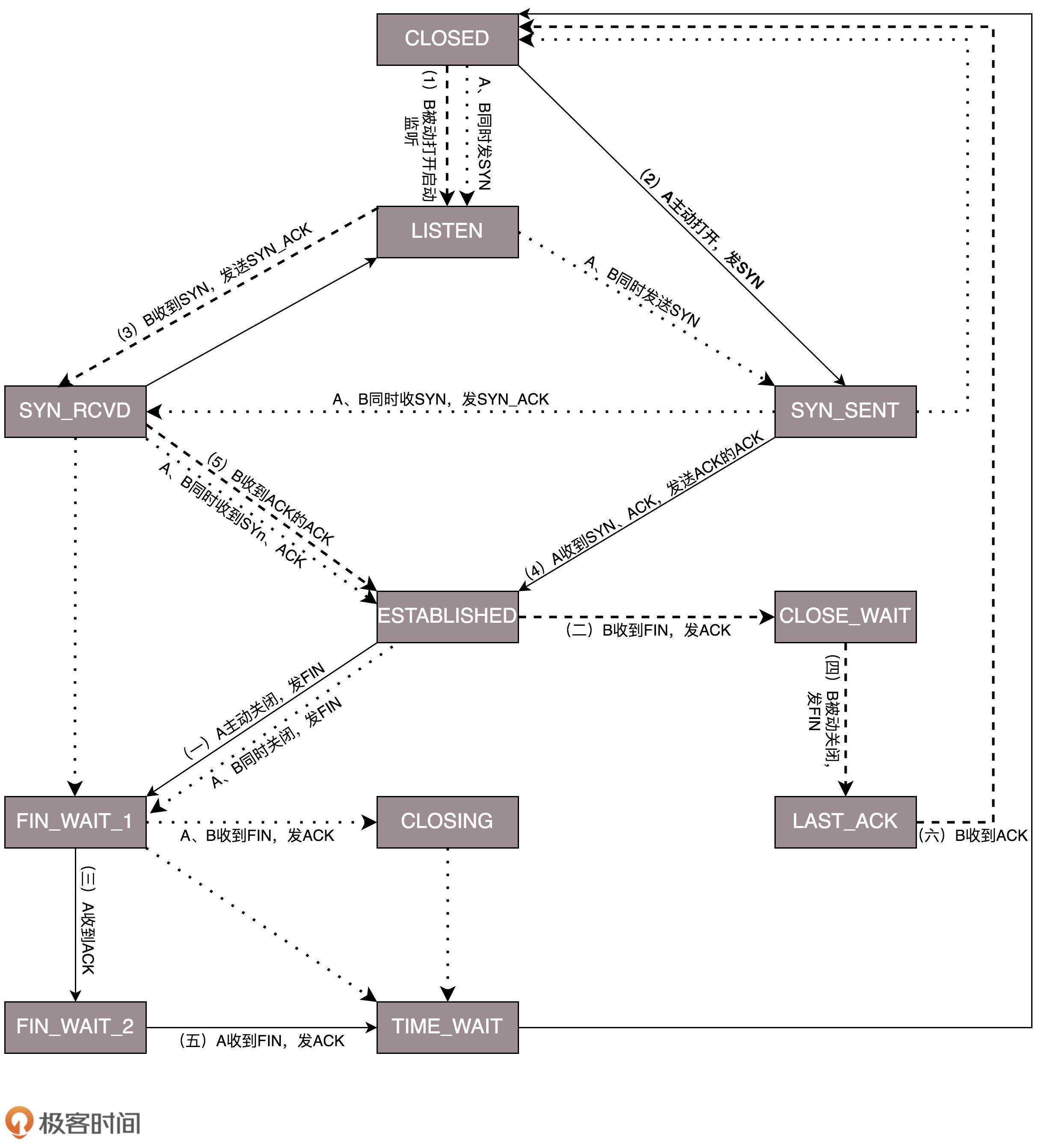 在这个图中,加黑加粗的部分,是上面说到的主要流程,其中阿拉伯数字的序号,是连接过程中的顺序,而大写中文数字的序号,是连接断开过程中的顺序。加粗的实线是客户端A的状态变迁,加粗的虚线是服务端B的状态变迁。