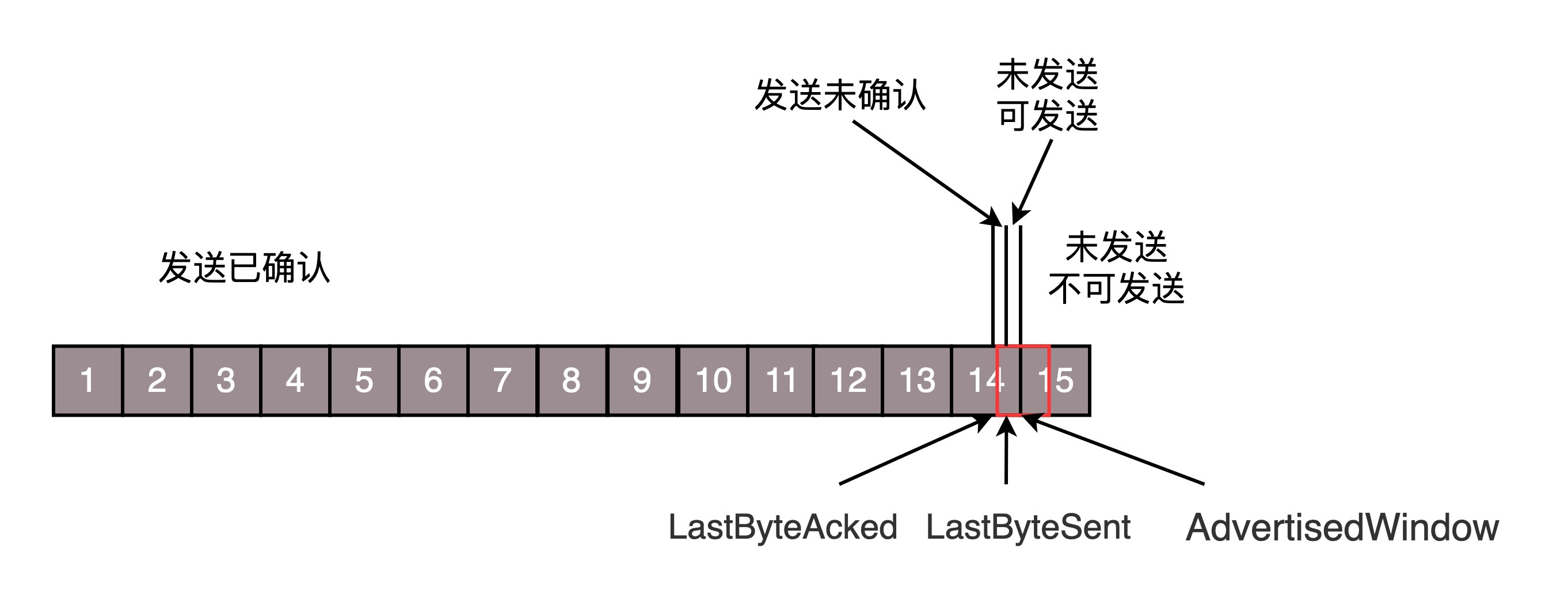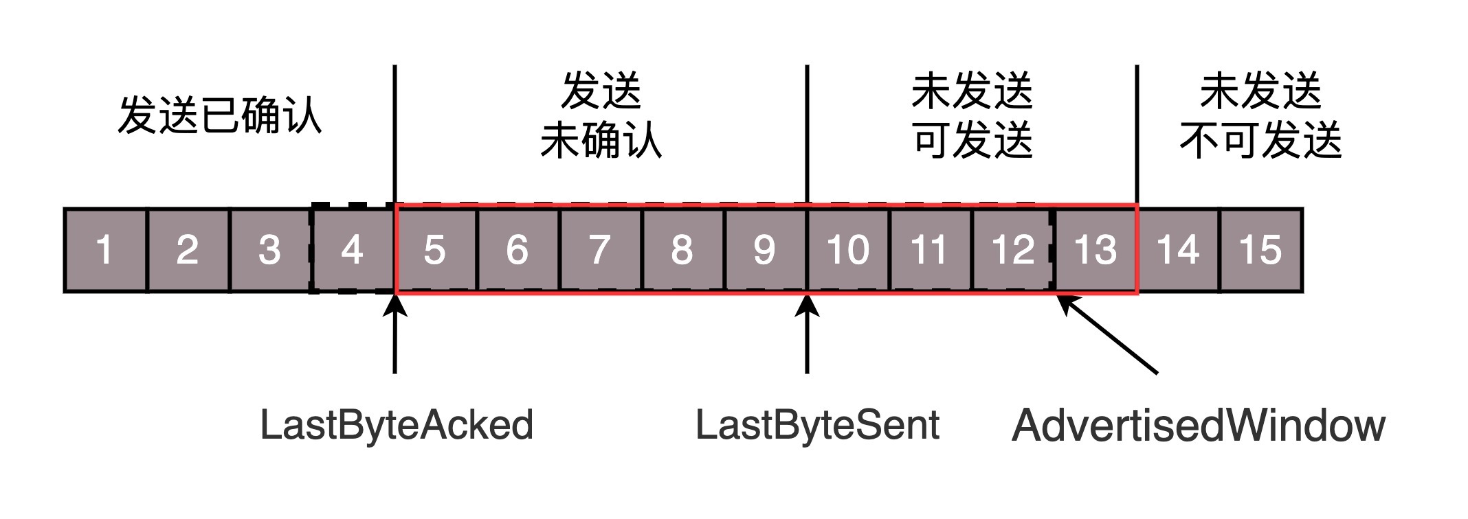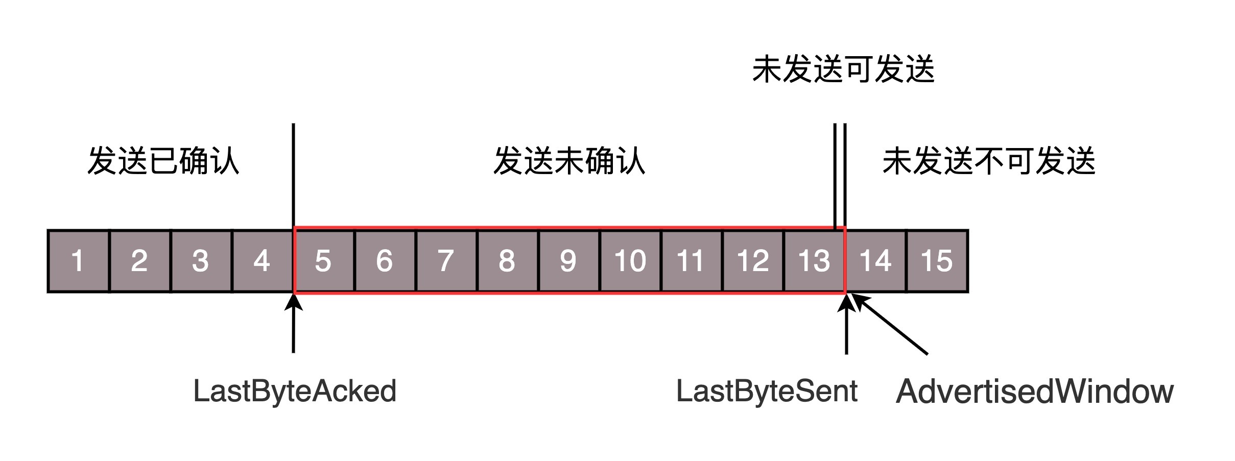 还是刚才的图,在发送端来看,1、2、3已经发送并确认;4、5、6、7、8、9都是发送了还没确认;10、11、12是还没发出的;13、14、15是接收方没有空间,不准备发的。