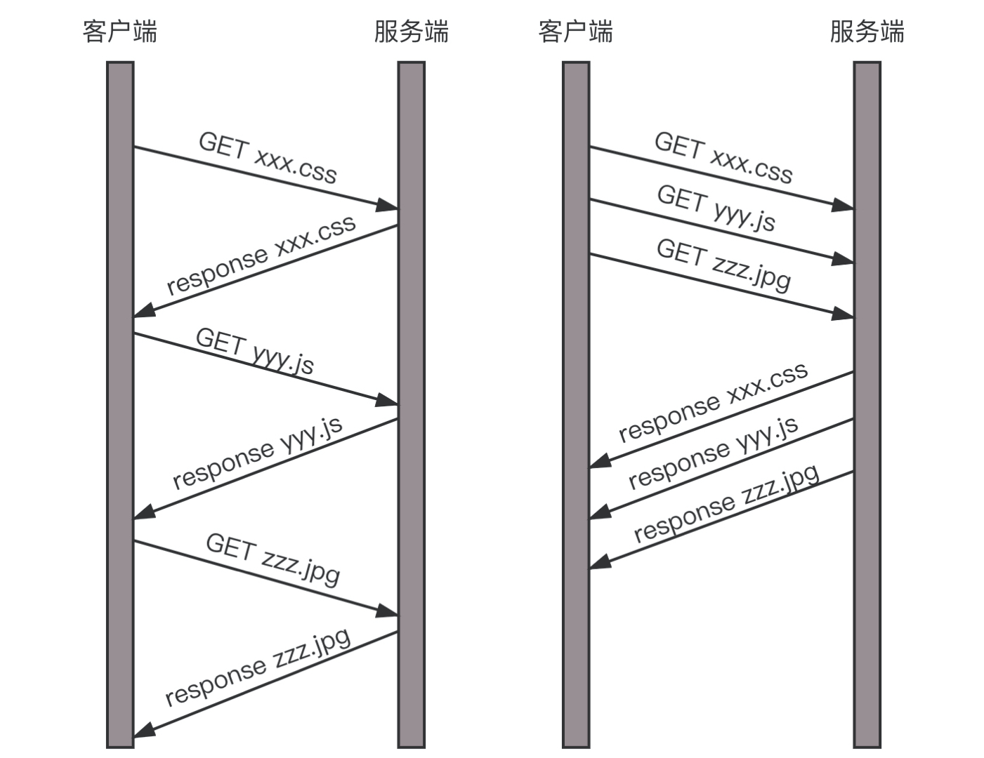 假设我们的一个页面要发送三个独立的请求,一个获取css,一个获取js,一个获取图片jpg。如果使用HTTP 1.1就是串行的,但是如果使用HTTP 2.0,就可以在一个连接里,客户端和服务端都可以同时发送多个请求或回应,而且不用按照顺序一对一对应。