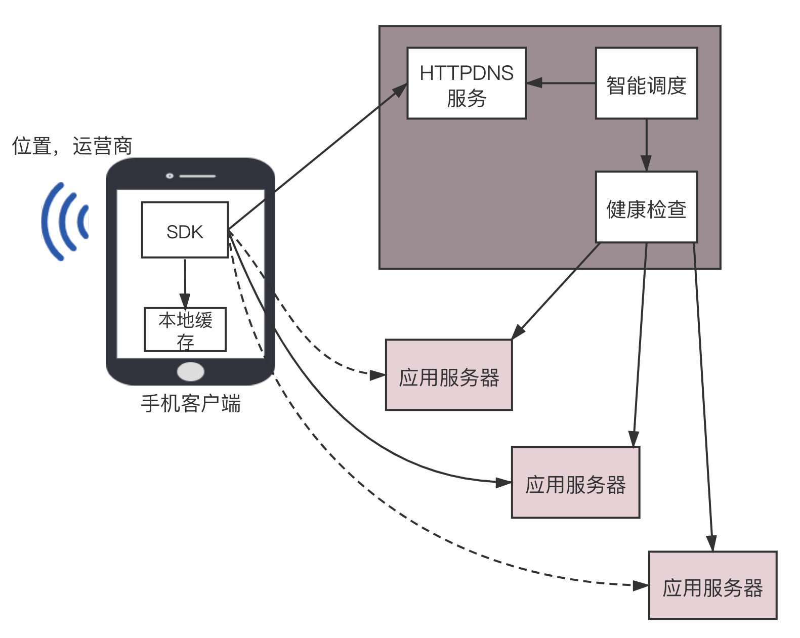 • 对于HttpDNS来讲,就是手机客户端、DNS缓存、HttpDNS服务器。