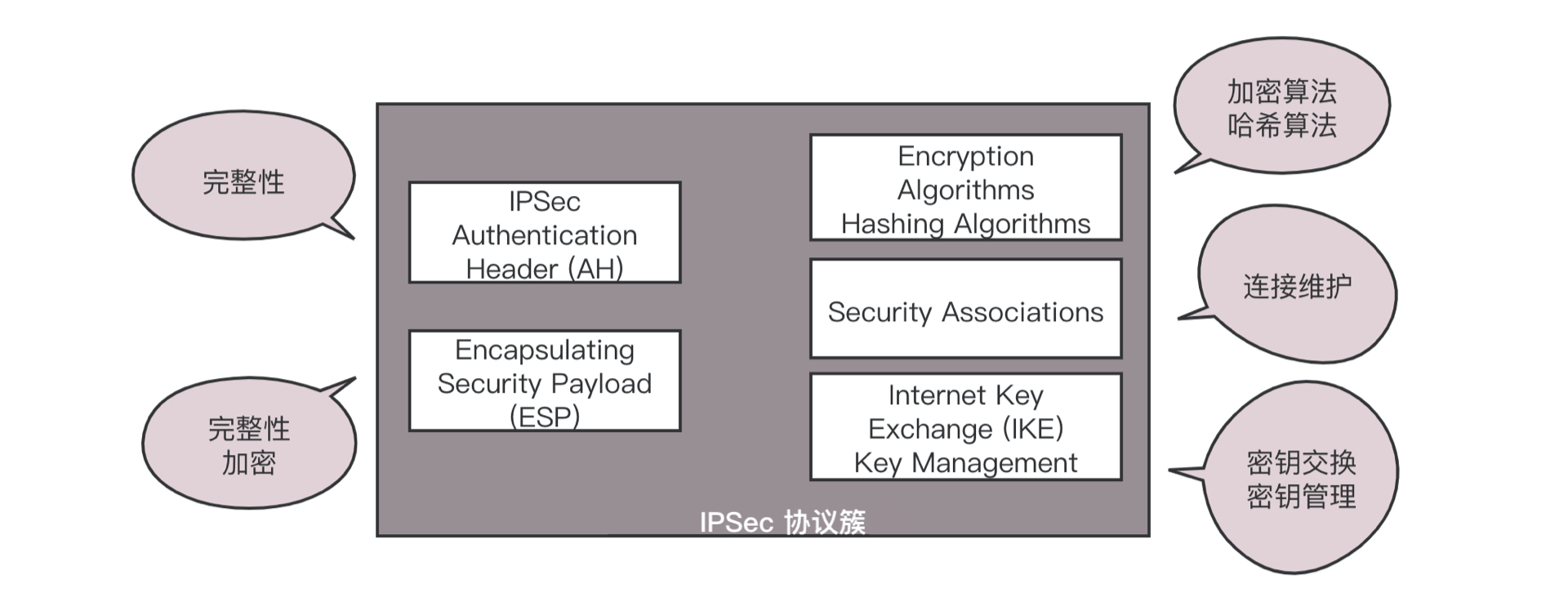 基于以上三个特性,组成了IPsec VPN的协议簇。这个协议簇内容比较丰富。