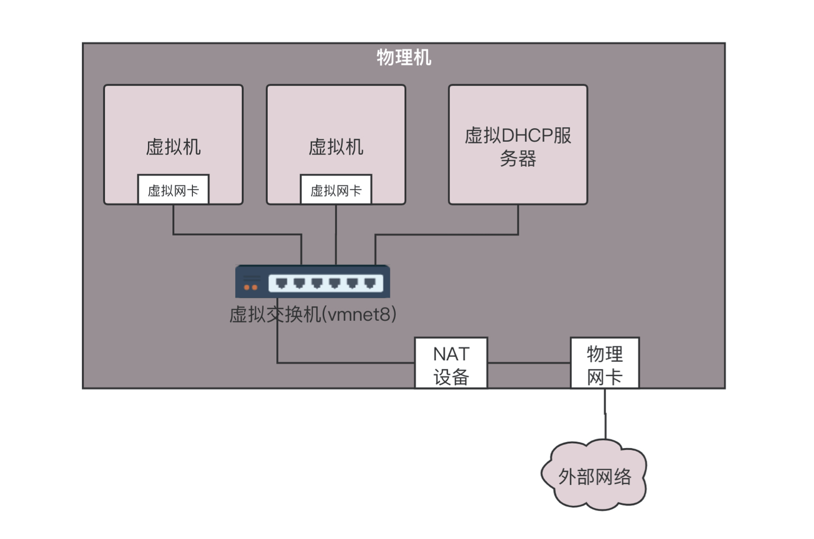 除此之外,它还会在你的笔记本电脑里内置一个DHCP服务器,为笔记本电脑上的虚拟机动态分配IP地址。因为虚拟机的网络自成体系,需要进行IP管理。为什么桥接方式不需要呢?因为桥接将网络打平了,虚拟机的IP地址应该由物理网络的DHCP服务器分配。