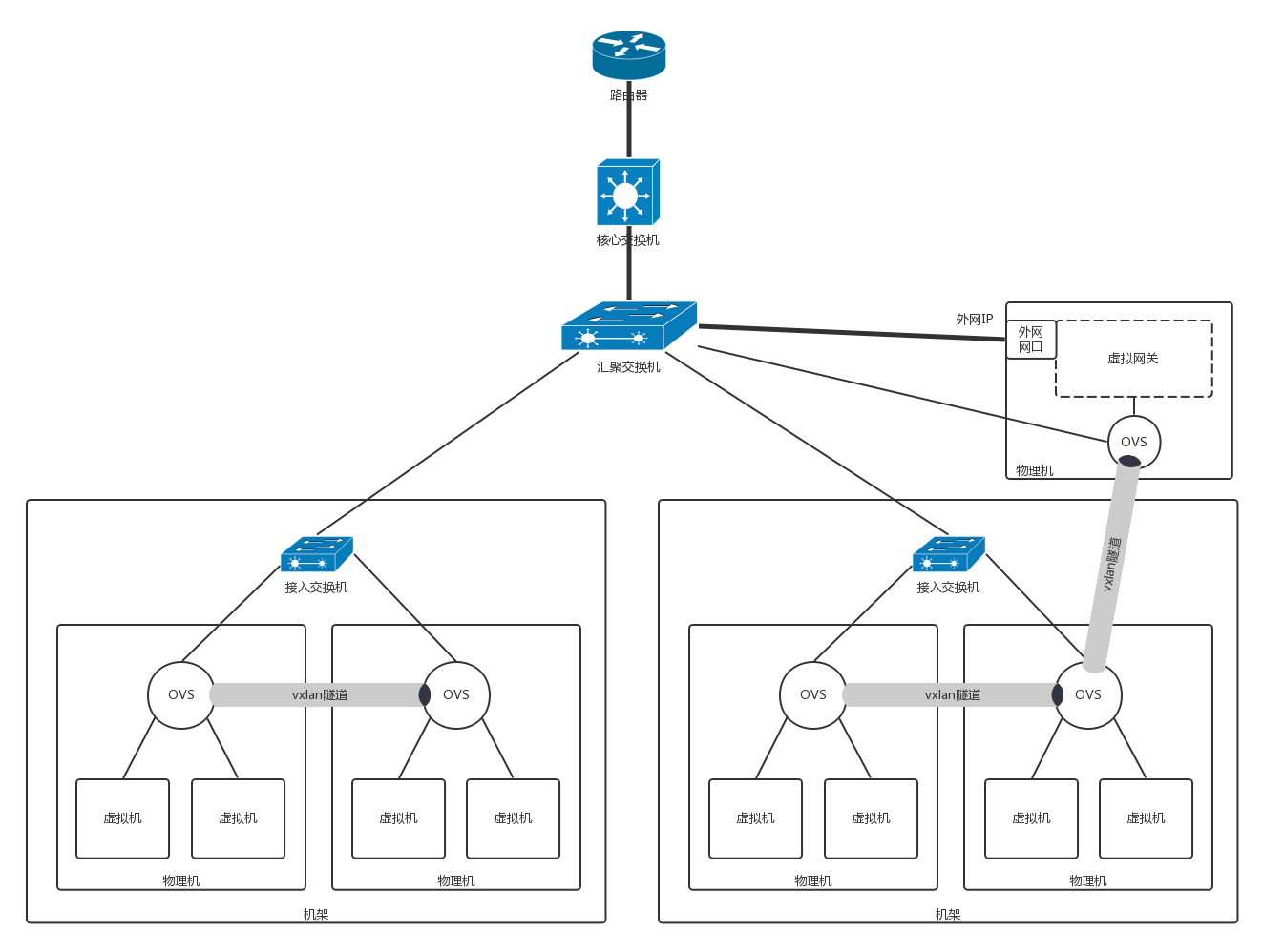 网关节点的外网网口是带公网IP地址的,里面有一个虚拟网关转发模块,还会有一个OVS,将私网IP地址放到VXLAN隧道里面,转发到虚拟机上,从而实现外网和虚拟机网络之间的互通。