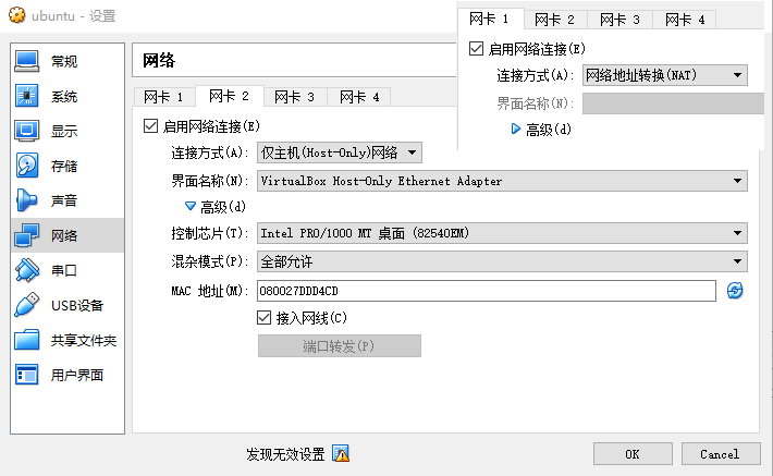 另一个网卡配置为NAT网络,用于访问互联网。配置了NAT网络之后,只要你的笔记本电脑能上网,虚拟机就能上网。由于咱们在Ubuntu里面要安装一些东西,因而需要联网。