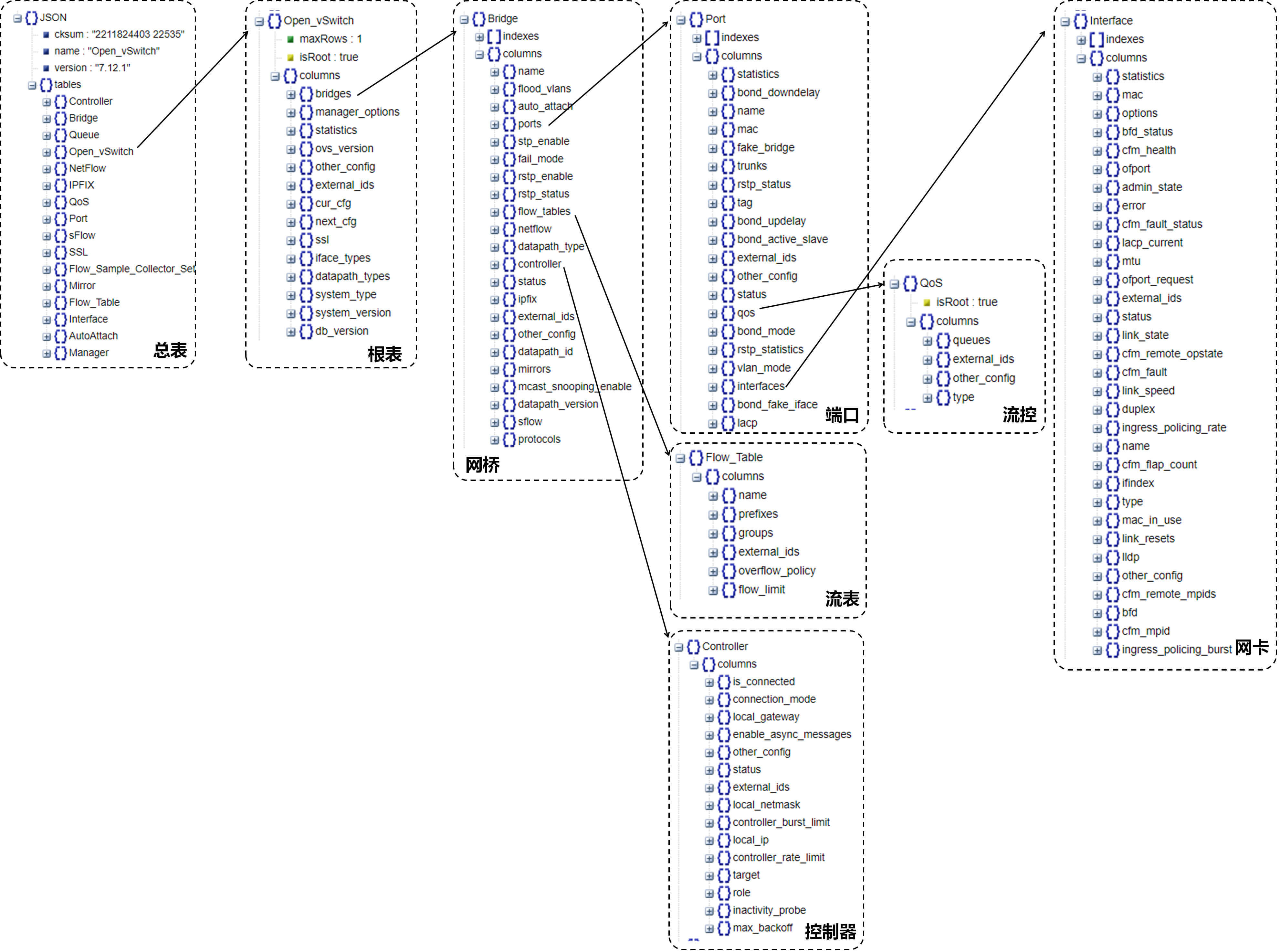 这个库其实是一个JSON,如果把这个JSON打印出来,能够看到更加详细的特性。按照这些特性一一实验,可以逐渐把Open vSwitch各个特性都掌握。