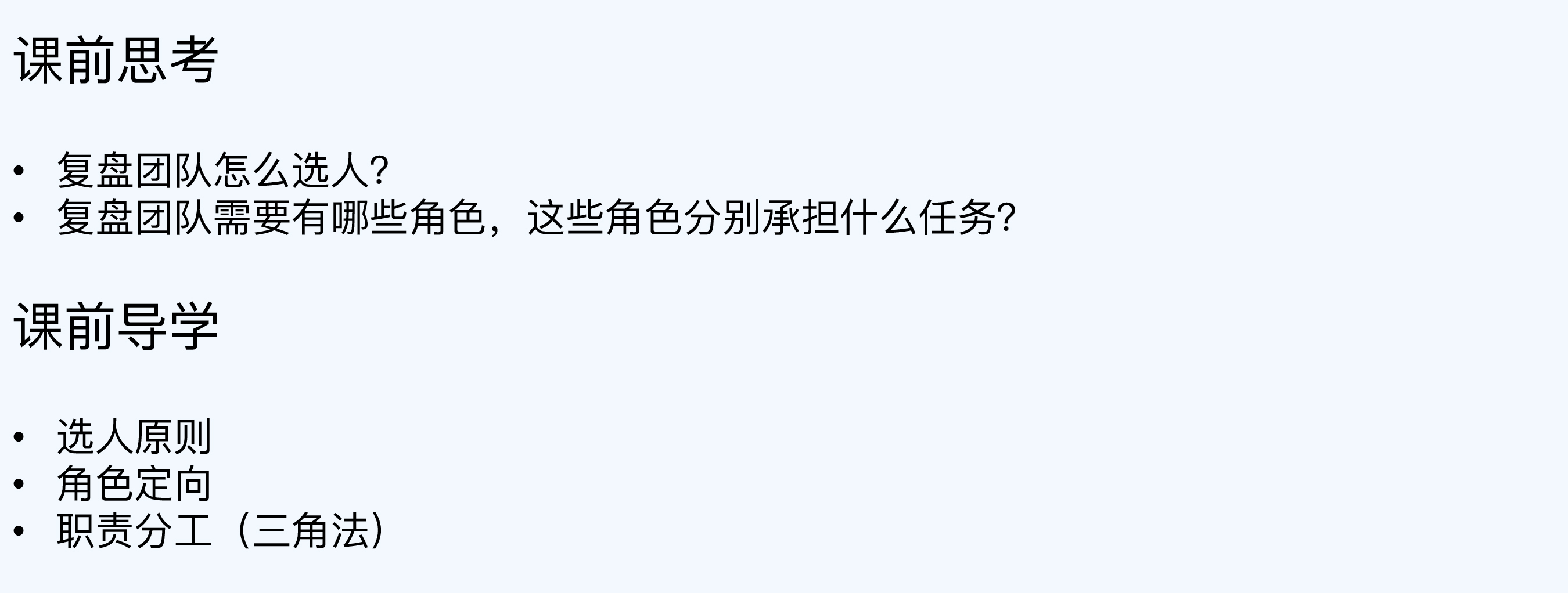 在数学上,三角形是最稳定的形状。而组建复盘团队的时候,我们也可以用三角法,搭建一个各司其责的三角团队,从而保障复盘会议的产出、效率和氛围。