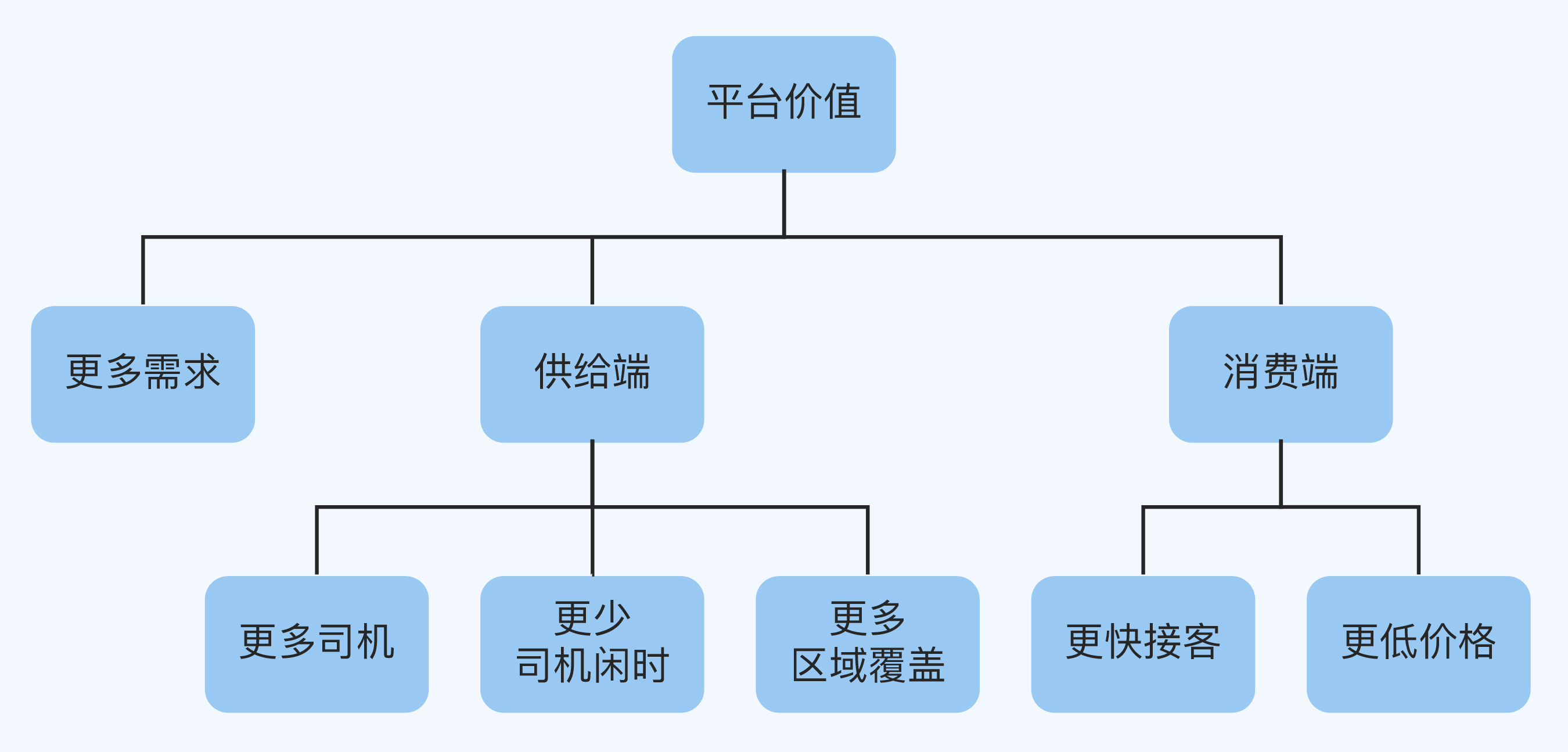 从消费端看,核心是乘客能更快能坐上车和车费更便宜,分别代表时间和价格两个维度,于是他们又标记了两个关键节点,更快接客和更低价格。