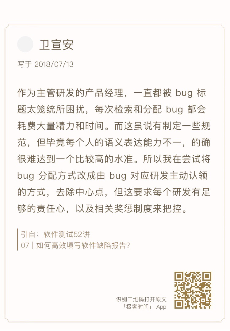 另外,我发现读者在文章的留言中也提出了很多建设性的方法。比如,下面这位昵称为“卫宣安”的读者,提出了让开发人员主动来认领缺陷的方式。如果说所有的开发人员都具有很强的责任心,同时系统规模也不是太大,或者说报告的缺陷数量不是很多的情况下,这的确是解决问题的一个好思路。但是,当团队规模比较大,缺陷数量也比较多的时候,要求每个开发人员都去挨个查看所有缺陷的效率就会很低。