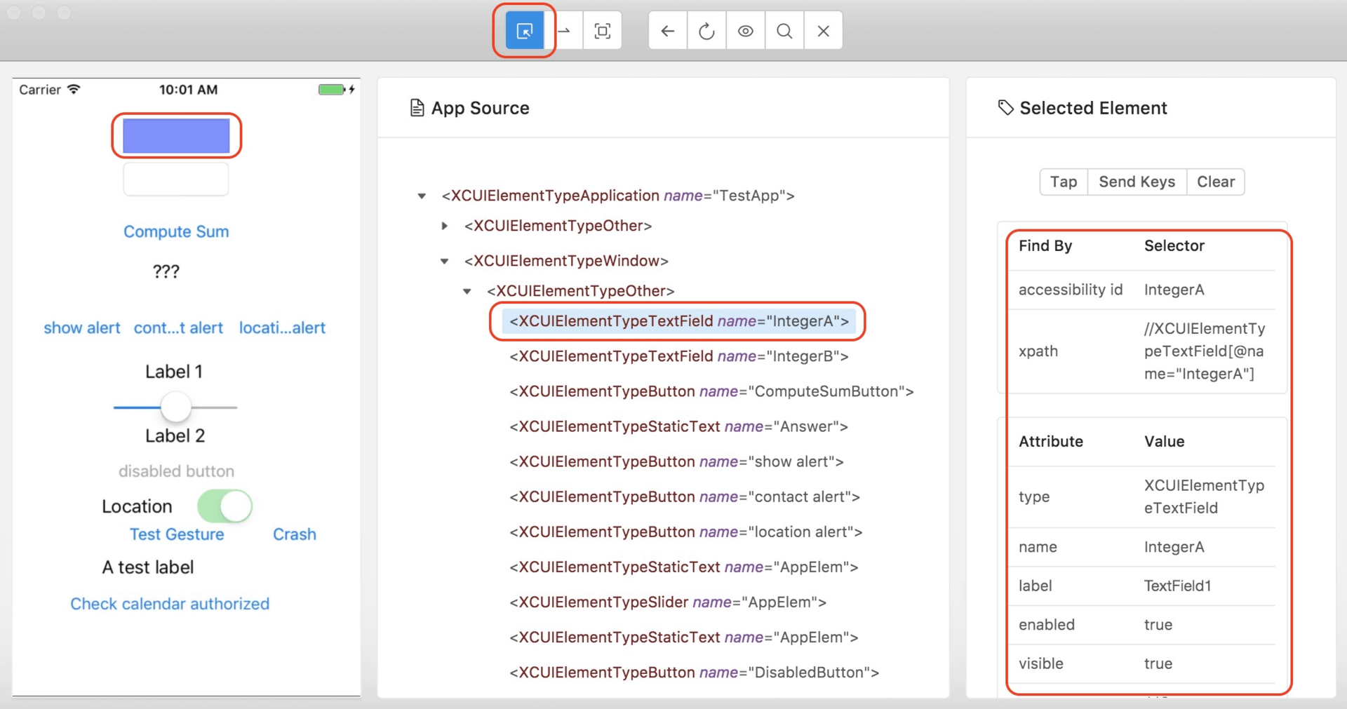 首先,我们来看看如何使用Appium Inspector启动iPhone的模拟器,并在模拟器上运行TestApp,以及如何通过Inspector定位TestApp界面上的元素(了解元素的定位是后续开发自动化脚本的基础)。具体的操作过程如下。